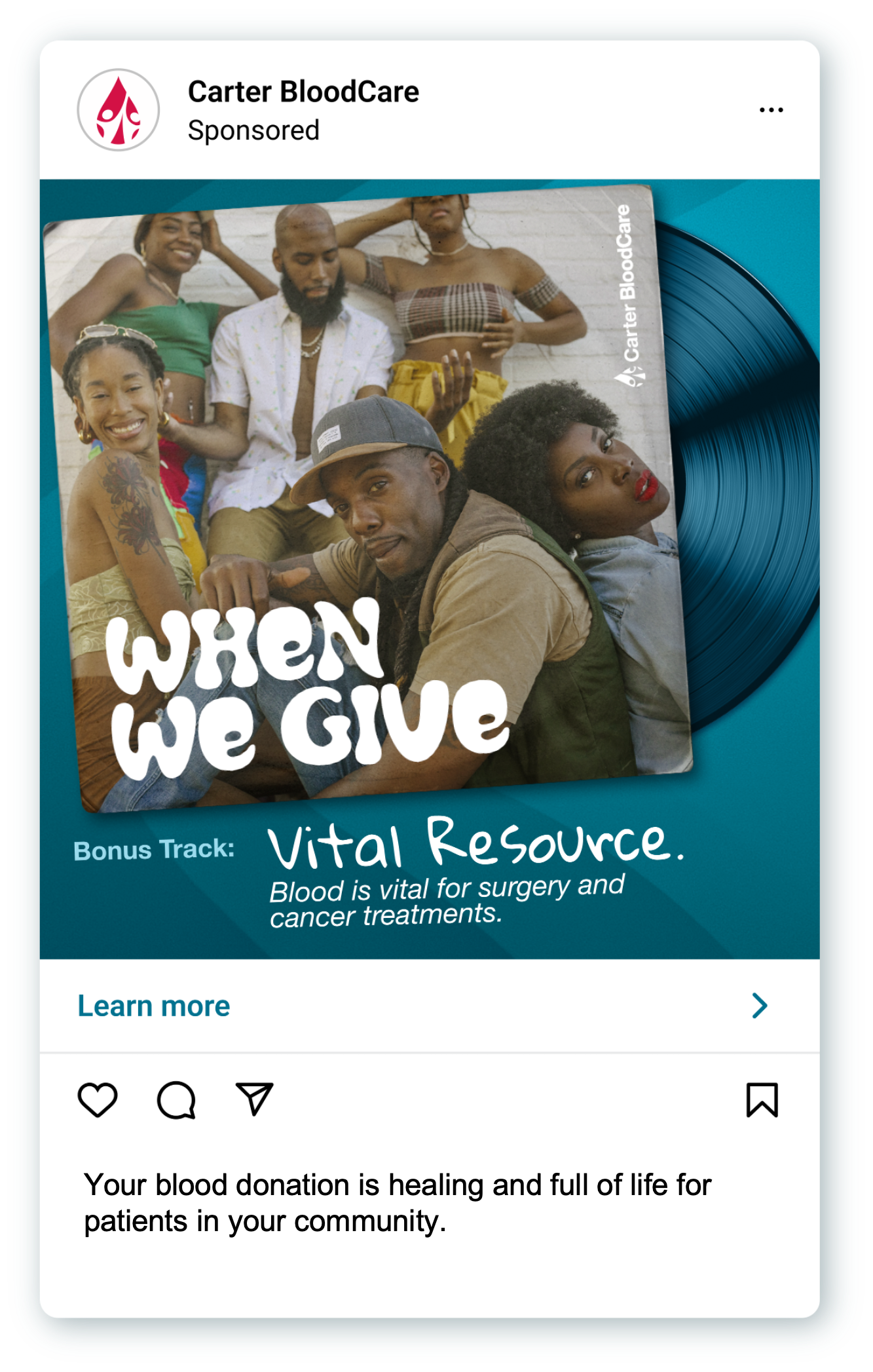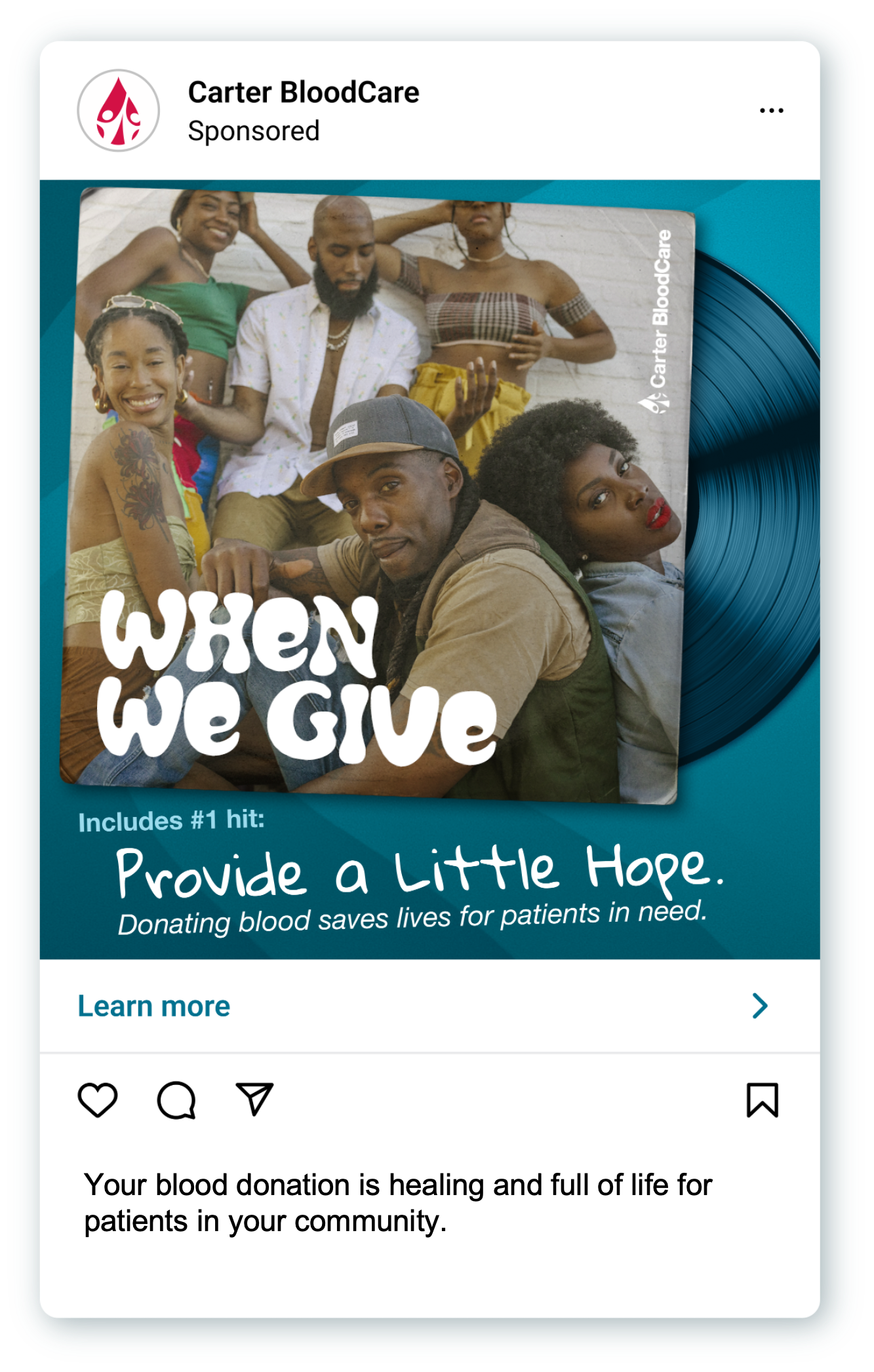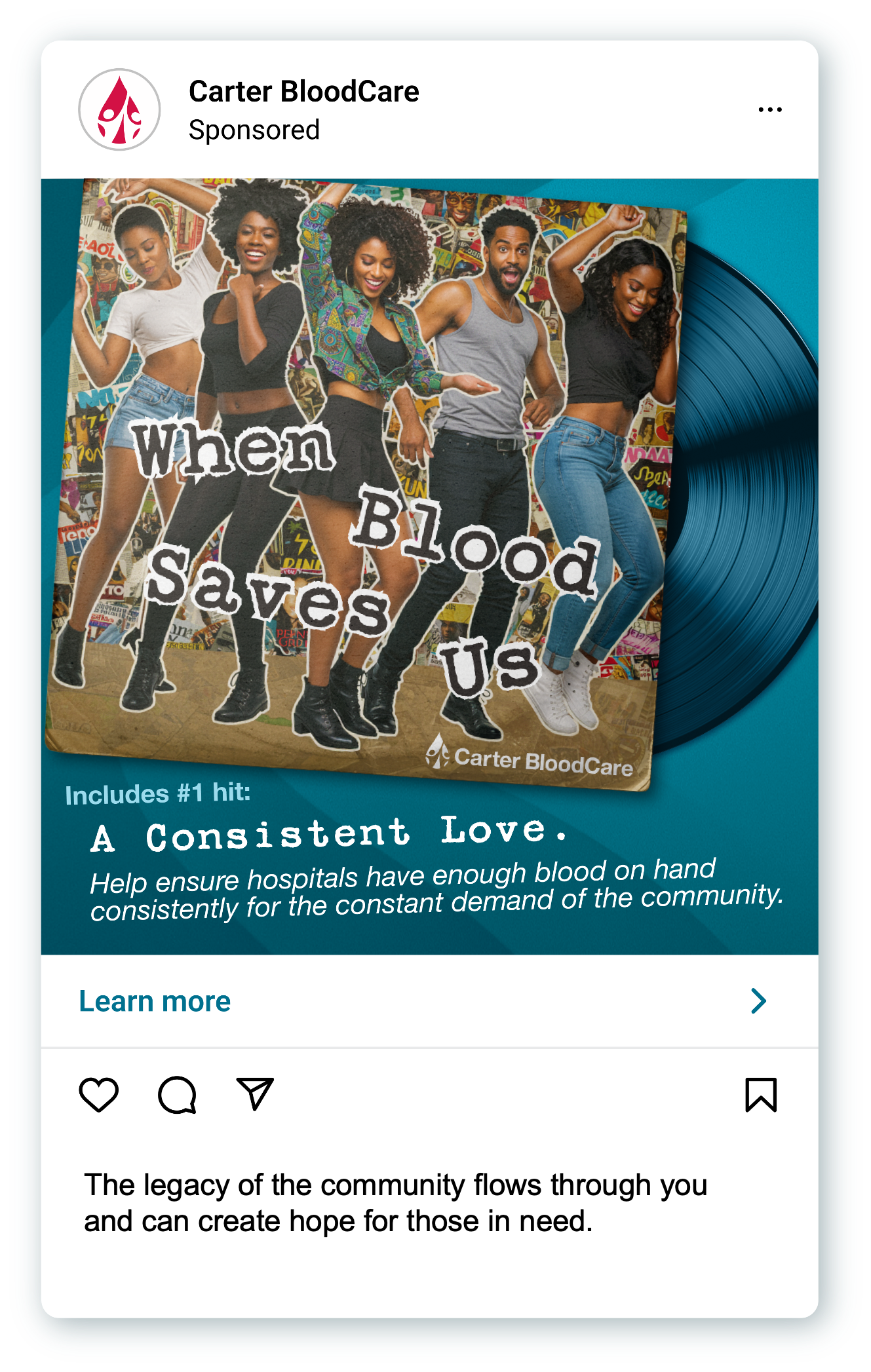 Created an album cover that connects copy with image. A group of friends dancing for the love of community donating blood.
