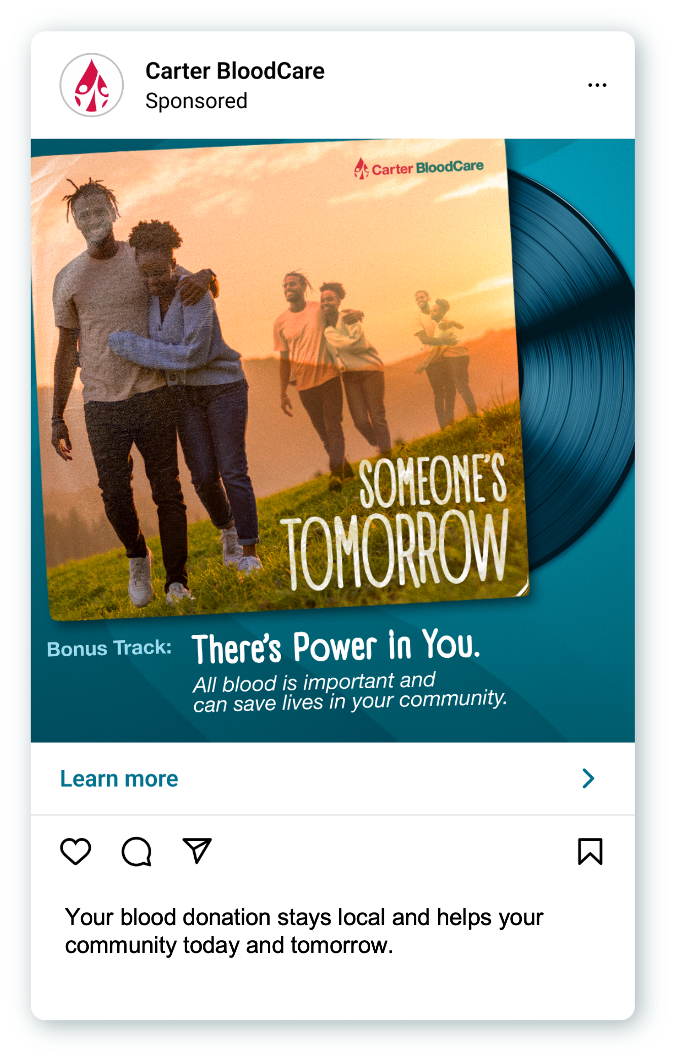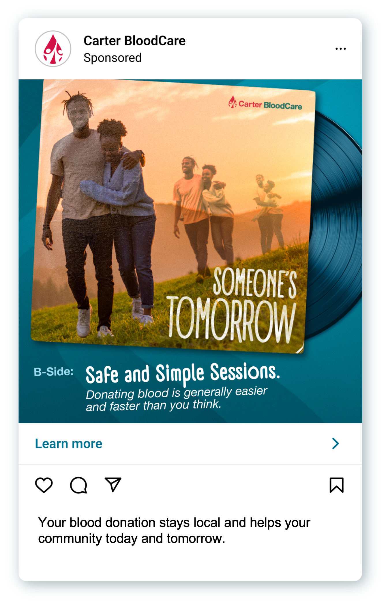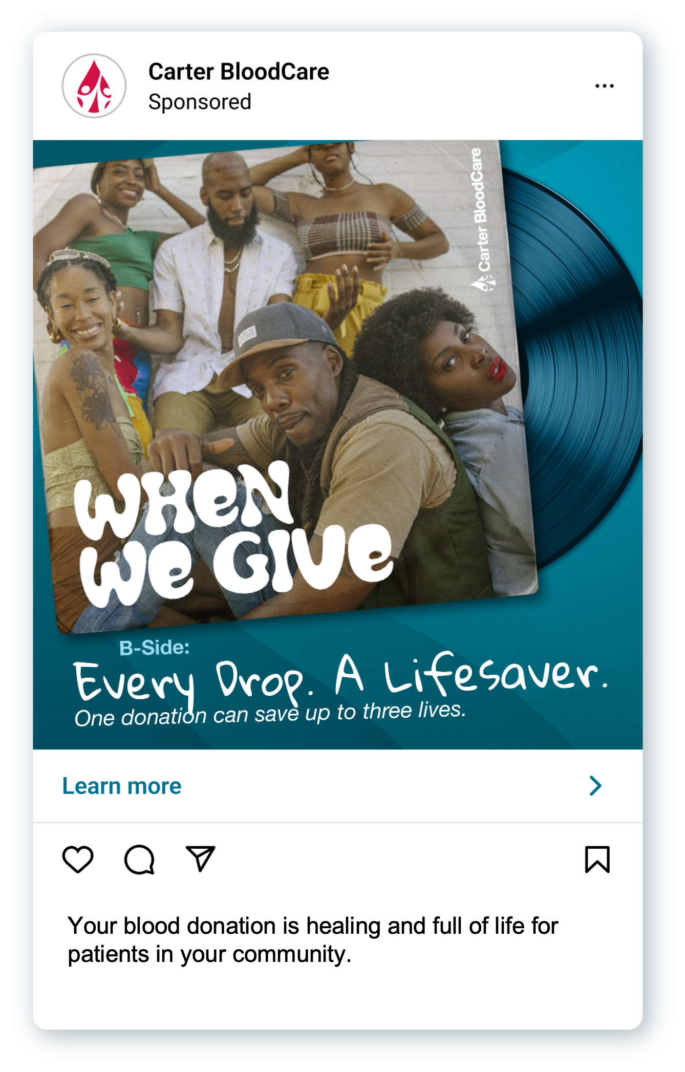 Created an album cover that connects copy with image. A group of friends dancing for the love of community donating blood.